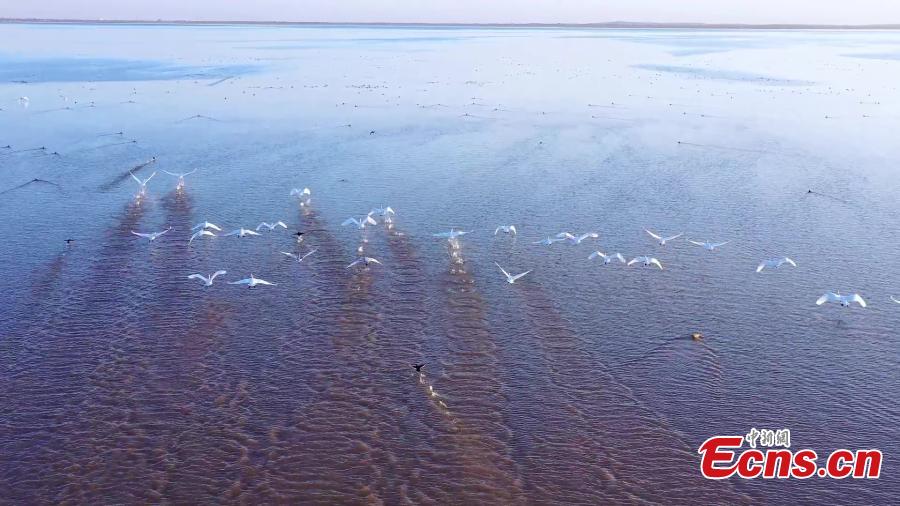 A flock of migratory birds swim in the lake of Hongjiannao National Nature Reserve in Shenmu, northwest China's Shaanxi Province. (Photo: China News Service/Liu Jiangang)