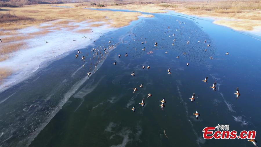 A flock of migratory birds fly over the lake of Hongjiannao National Nature Reserve in Shenmu, northwest China's Shaanxi Province. (Photo: China News Service/Liu Jiangang)