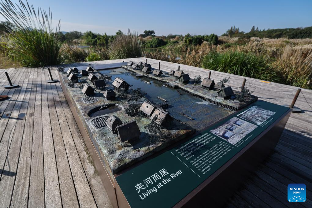 This photo taken on Nov. 7, 2023 shows the residence model of the Liangzhu ancestors living along the river at the Archaeological Ruins of Liangzhu City park in Hangzhou, capital city of east China's Zhejiang Province.?(Xinhua/Xu Yu)