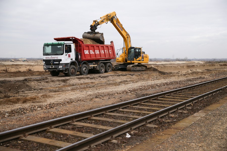 Engineering vehicles are seen at a construction site of Hungary-Serbia railway project in Delegyhaza, Hungary, Feb. 22, 2023. (Xinhua/Zheng Huansong)
