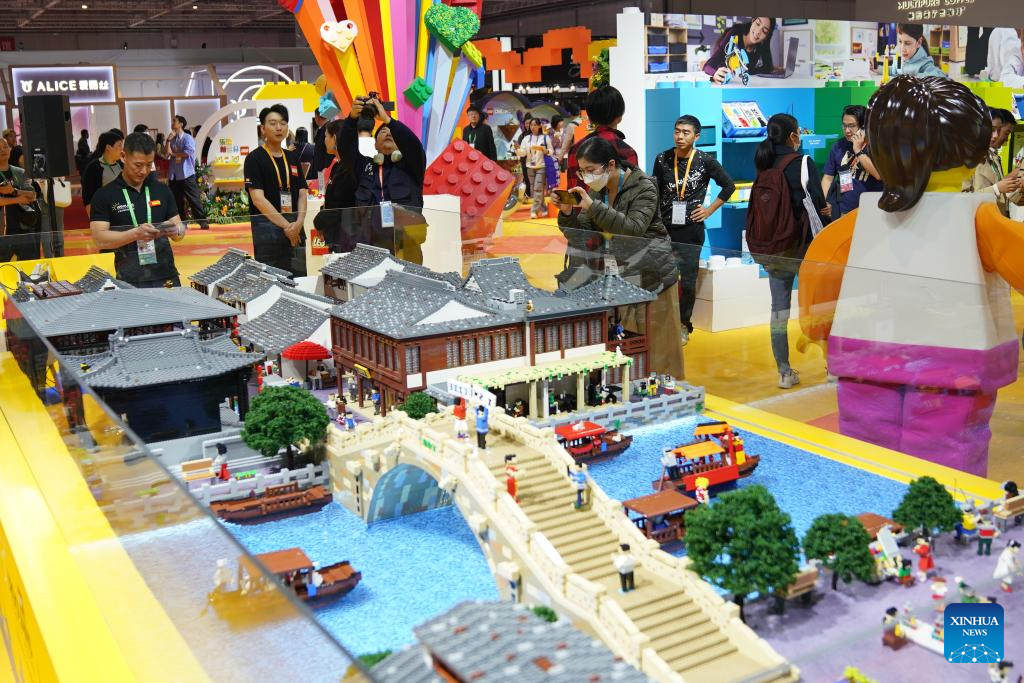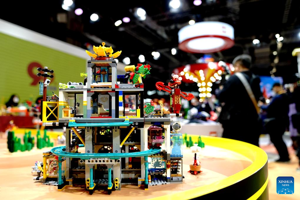 Toy products are displayed at the booth of Danish toy giant LEGO Group during the sixth China International Import Expo (CIIE) in Shanghai, east China, Nov. 6, 2023.?(Xinhua/Zhang Keren)