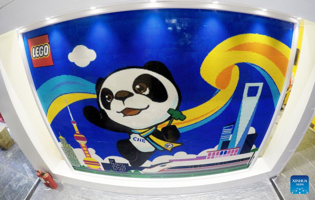 This photo taken on Oct. 31, 2018 shows a building block wall built with LEGO bricks with image of Jinbao, mascot of the China International Import Expo (CIIE), at the National Exhibition and Convention Center (Shanghai) in Shanghai, east China.?(Xinhua/Fang Zhe)