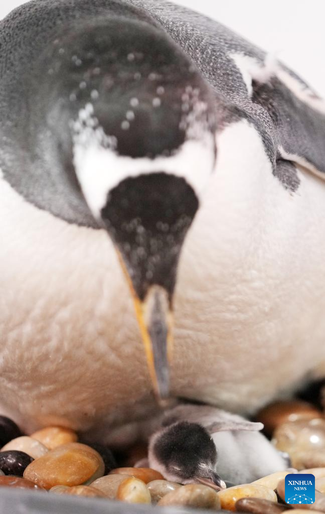 The mother penguin takes care of its newborn baby at Harbin Polarland in Harbin, capital of northeast China's Heilongjiang Province, Nov. 8, 2023. (Xinhua/Wang Jianwei)