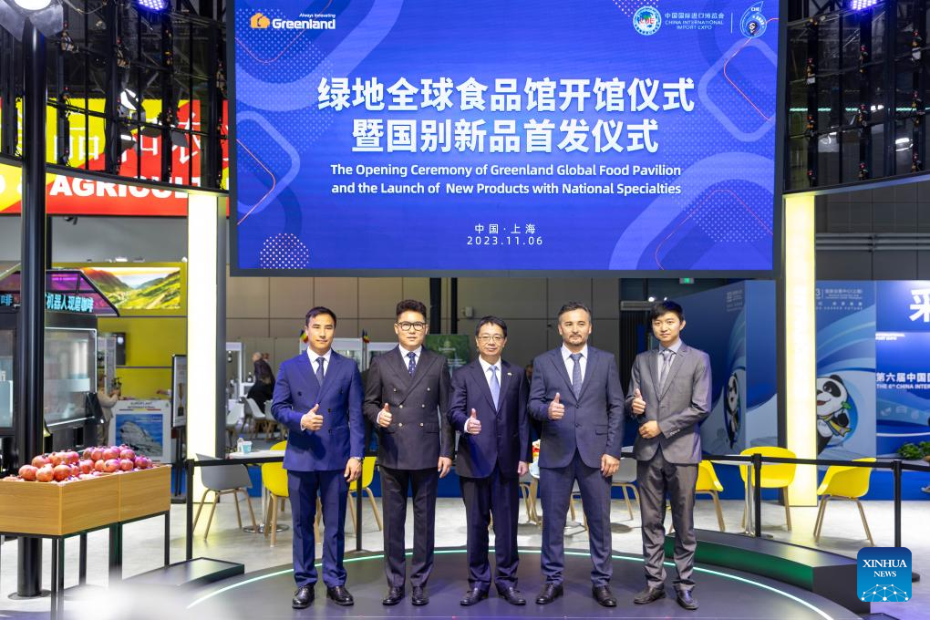 Ali Faiz (1st L) poses for a group photo at the opening ceremony of Greenland Global Food Pavilion and the launch of new products with national specialties during the 6th China International Import Expo (CIIE) in east China's Shanghai, Nov. 6, 2023. (Xinhua/Wang Xiang)