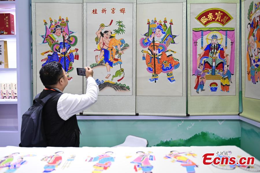 A visitor takes photos of Mianzhu wood engraving New Year paintings, or nianhua in Chinese, a representative project of national intangible cultural heritage at the 6th China International Import Expo (CIIE) in Shanghai, Nov. 7, 2023. (Photo: China News Service/Tian Yuhao)