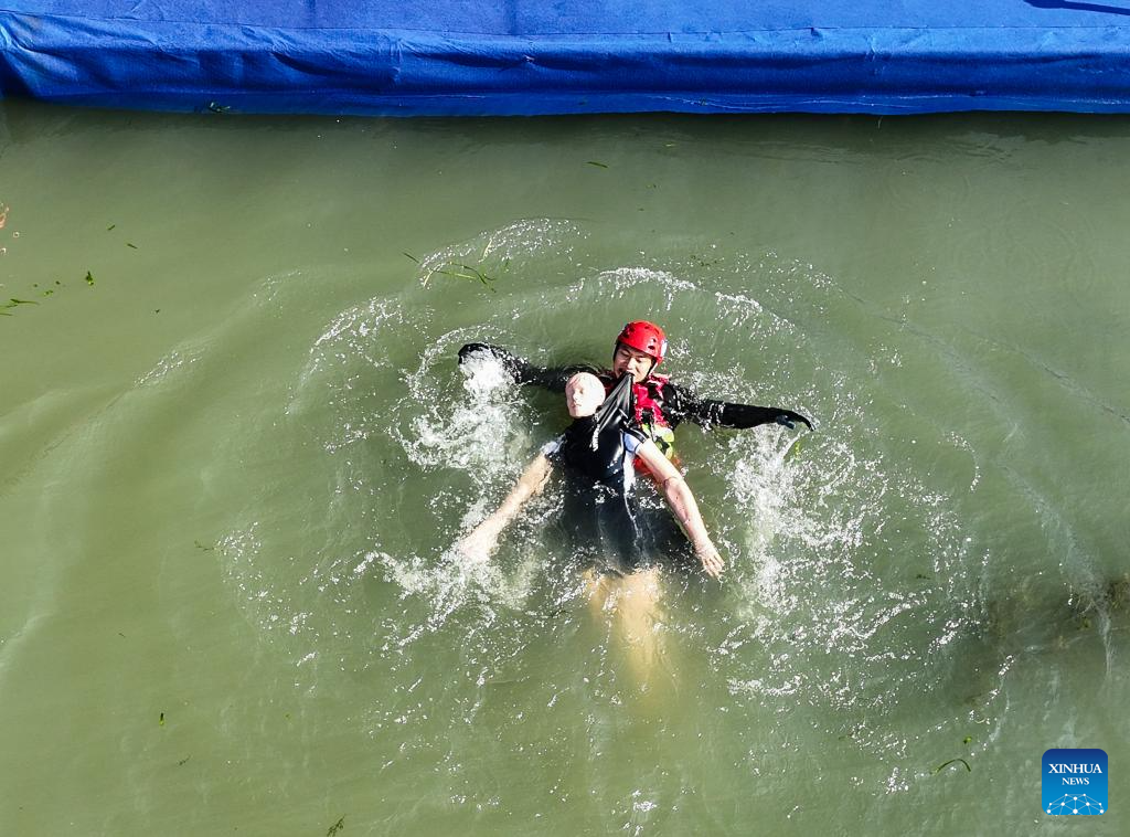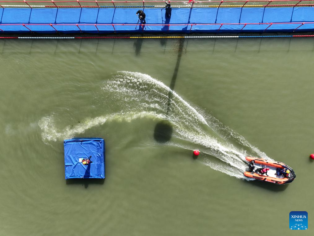 This aerial photo taken on Nov. 8, 2023 shows a firefighter competing in a water rescue contest during the national fire and rescue professional skill competition held in Nanjing, east China's Jiangsu Province. A total of 343 firefighters from around the country competed in this skill competition on Wednesday. (Xinhua/Ji Chunpeng)