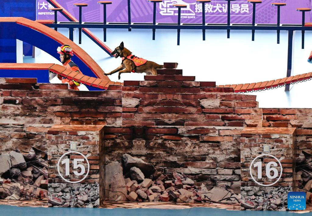 A firefighter and his rescue dog compete in the national fire and rescue professional skill competition held in Nanjing, east China's Jiangsu Province, Nov. 8, 2023. A total of 343 firefighters from around the country competed in this skill competition on Wednesday. (Xinhua/Ji Chunpeng)