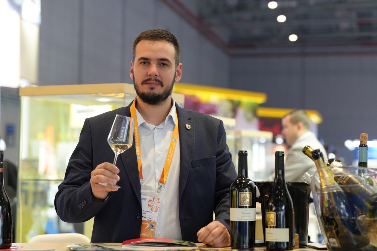 Miller Sherman, a wine exhibitor from Serbia, presents his wine collection to visitors in the food and agriculture exhibition area at the sixth China International Import Expo (CIIE) in Shanghai, east China, Nov. 7, 2023. (People’s Daily Online/Wu Chaolan)