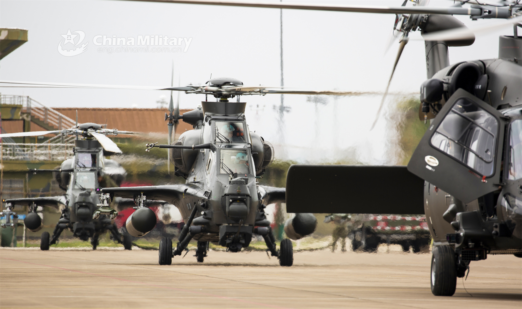 Army helicopters taxi on the runway of an air force station under the PLA Eastern Theater Command during a trans-regional operation on October, 22, 2023. (eng.chinamil.com.cn/Photo by Huang Guotai)