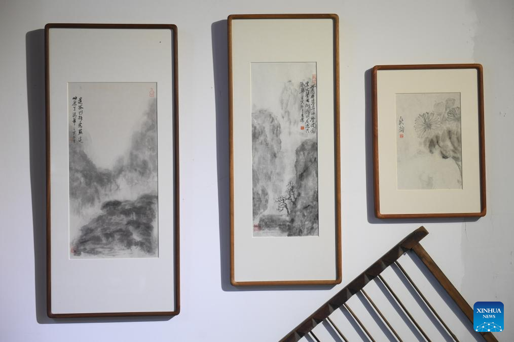 This photo taken on Nov. 9, 2023 shows ink and wash paintings done on modern Kaihua paper at Huang Hongjian's studio in Kaihua County of Quzhou, east China's Zhejiang Province. (Xinhua/Weng Xinyang)