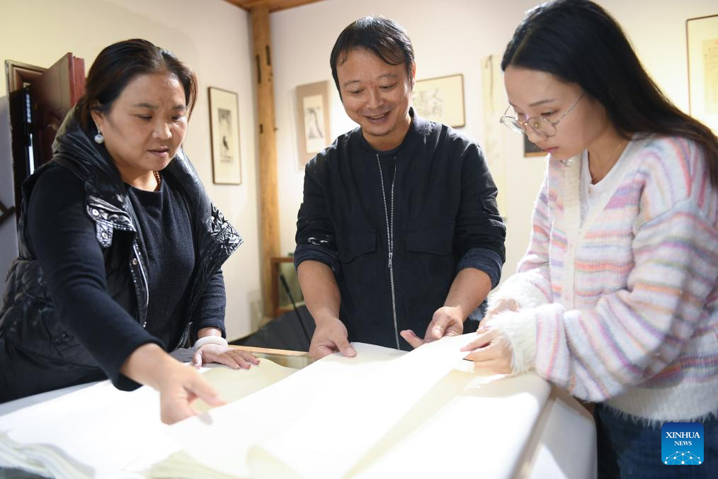 Huang Hongjian paints on a piece of paper he made at his studio in Kaihua County of Quzhou, east China's Zhejiang Province, Nov. 9, 2023. (Xinhua/Weng Xinyang)