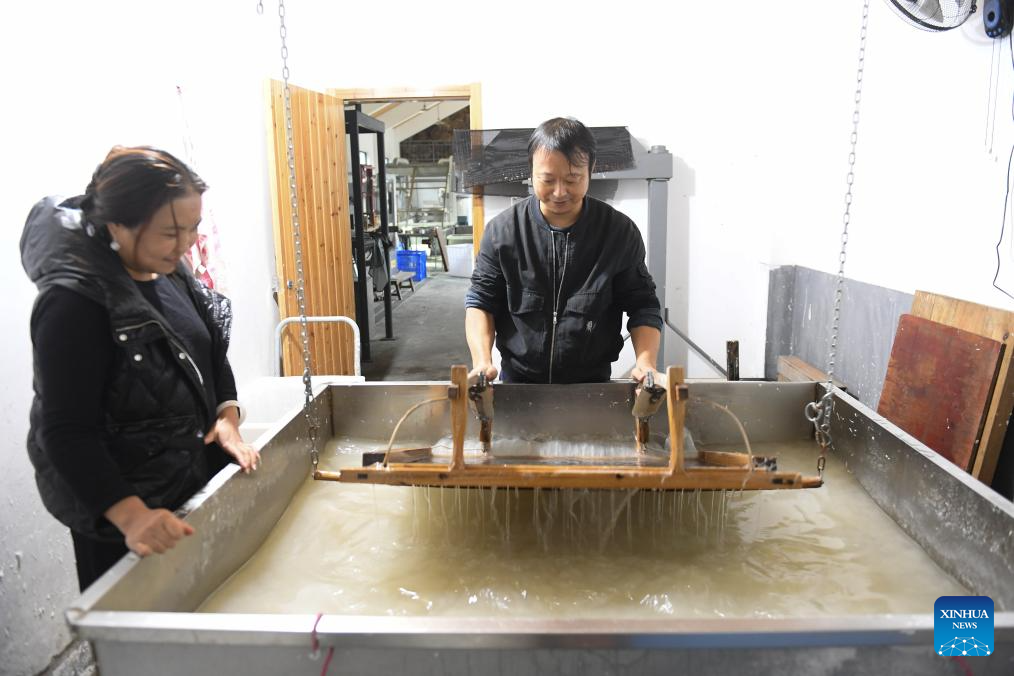 Huang Hongjian (R) sifts the papermaking solution at his studio in Kaihua County of Quzhou, east China's Zhejiang Province, Nov. 9, 2023. (Xinhua/Weng Xinyang)