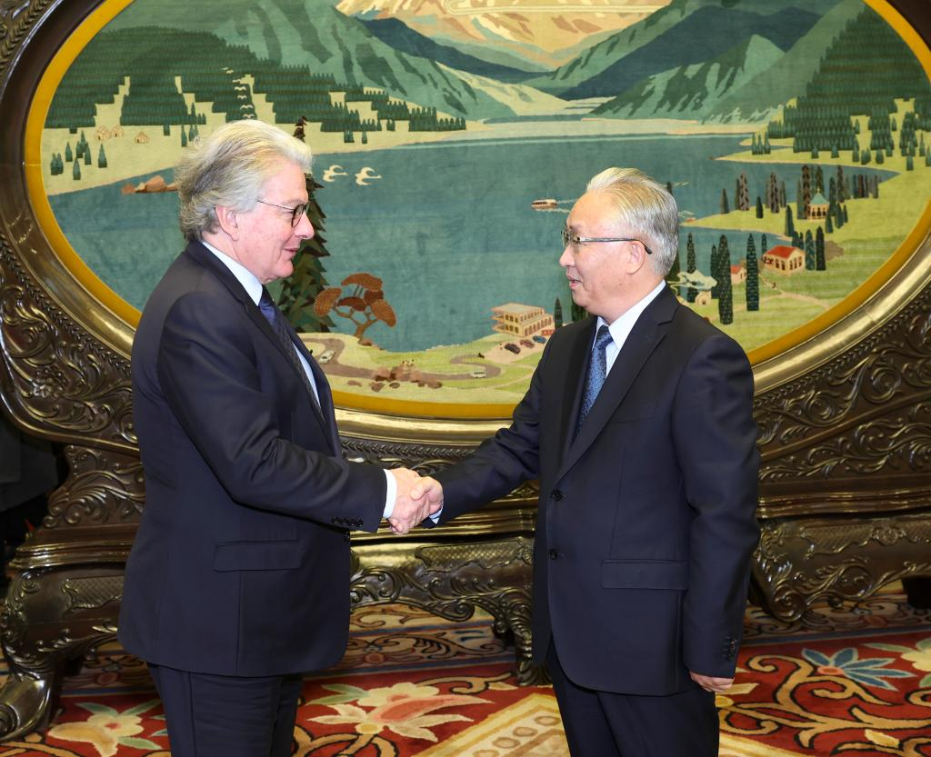 Chinese Vice Premier Zhang Guoqing, also a member of the Political Bureau of the Communist Party of China Central Committee, meets with European Union Commissioner for the Internal Market Thierry Breton in Beijing, capital of China, Nov. 10, 2023. (Xinhua/Pang Xinglei)