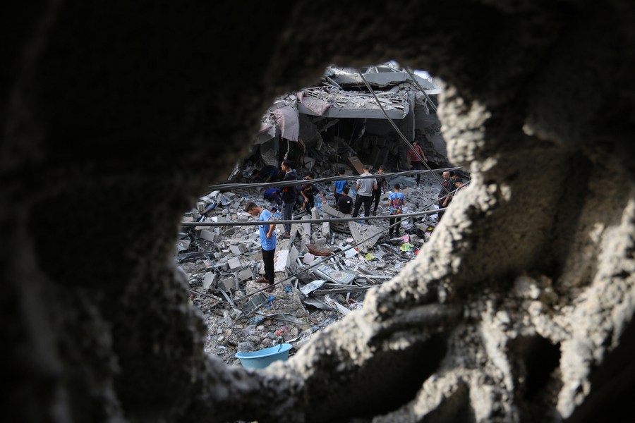 People are pictured among rubble of a building destroyed in Israeli military operations in the southern Gaza Strip city of Rafah, Nov. 11, 2023. (Photo by Khaled Omar/Xinhua)