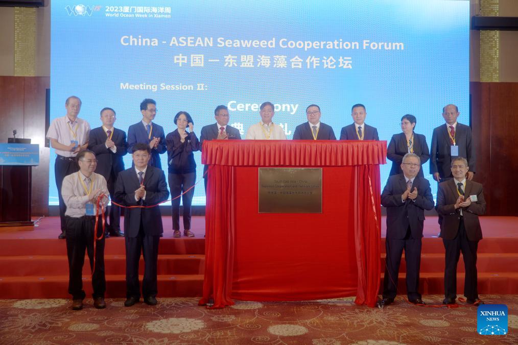 The Southeast Asia-China Seaweed Cooperation and Network Office is unveiled during the China-ASEAN Seaweed Cooperation Forum in Xiamen, southeast China's Fujian Province, Nov. 11, 2023.(Xinhua/Fu Min)