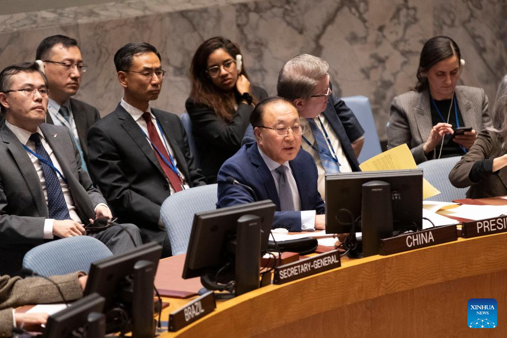 Chinese permanent representative to the United Nations Zhang Jun speaks at the UN Security Council emergency meeting on the Palestinian-Israeli situation at the UN headquarters in New York, Nov. 10, 2023. (Xinhua/Xie E)