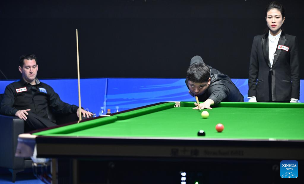 Zhang Anda (C) competes during the final between Zhang Anda of China and Tom Ford of England at World Snooker International Championship 2023 in north China's Tianjin Municipality, Nov. 12, 2023. (Xinhua/Li Ran)