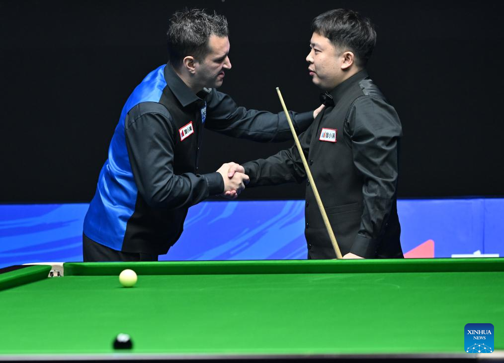 Zhang Anda (R) greets Tom Ford after the final between Zhang Anda of China and Tom Ford of England at World Snooker International Championship 2023 in north China's Tianjin Municipality, Nov. 12, 2023. (Xinhua/Li Ran)