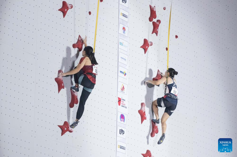 Deng Lijuan (L) of China competes against Jeong Jimin of South Korea during the Final of Women Speed of IFSC Asian Qualifier Jakarta 2023 in Jakarta, Indonesia, Nov. 12, 2023. (Xinhua/Veri Sanovri)