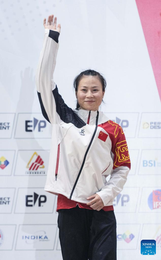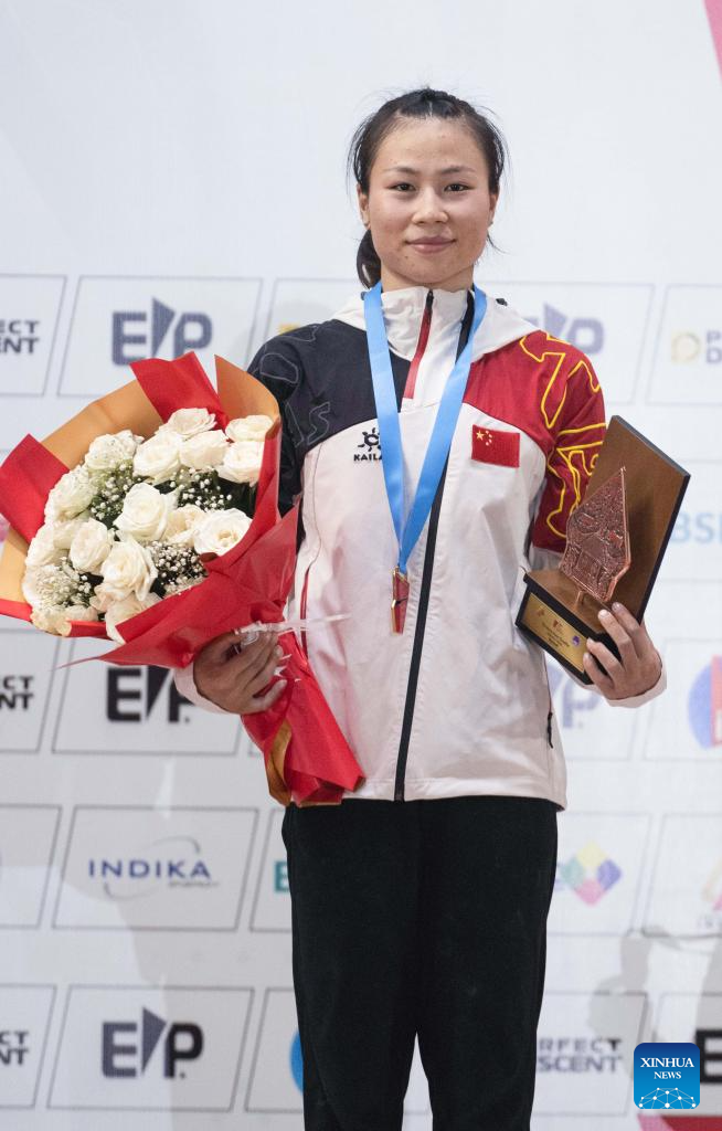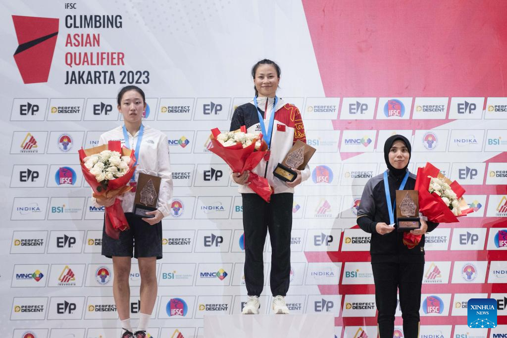Deng Lijuan of China poses for photos during the awarding ceremony after the Final of Women Speed of IFSC Asian Qualifier Jakarta 2023 against Jeong Jimin of South Korea in Jakarta, Indonesia, Nov. 12, 2023. (Xinhua/Veri Sanovri)