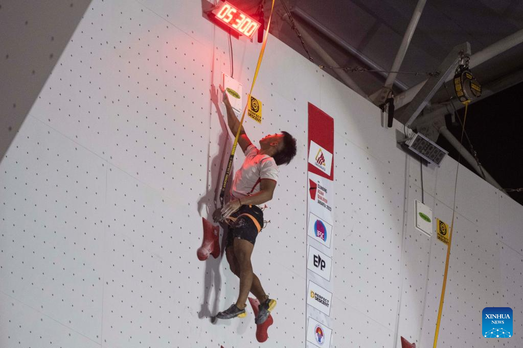 Rahmad Adi Mulyono of Indonesia competes during the Final of Men Speed of IFSC Asian Qualifier Jakarta 2023 in Jakarta, Indonesia, Nov. 12, 2023. (Xinhua/Xu Qin)