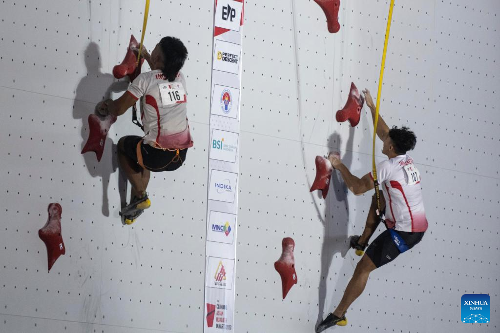 Rahmad Adi Mulyono (L) of Indonesia competes with his compatriot Katibin Kiromal during the Final of Men Speed of IFSC Asian Qualifier Jakarta 2023 in Jakarta, Indonesia, Nov. 12, 2023. (Xinhua/Xu Qin)