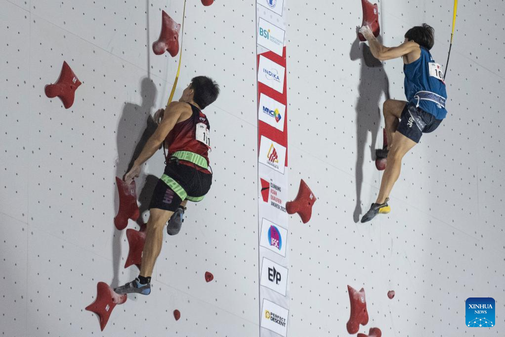 Wu Peng (L) of China competes with Omasa Ryo of Japan during the third place match of IFSC Asian Qualifier Jakarta 2023 in Jakarta, Indonesia, Nov. 12, 2023. (Xinhua/Xu Qin)