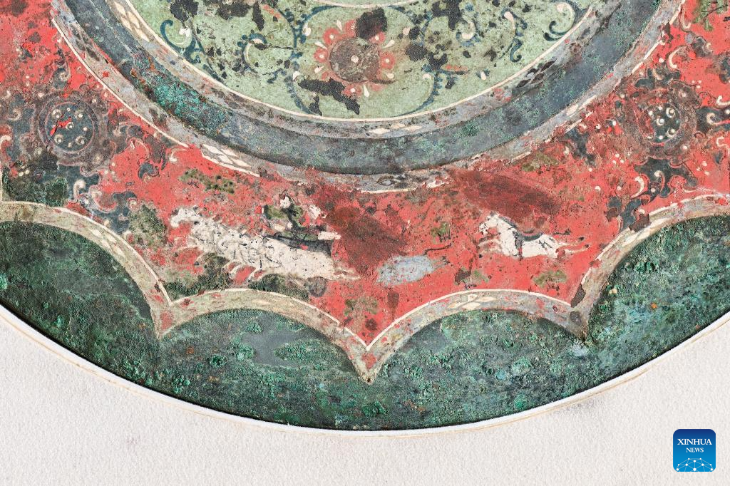 This photo taken on Aug. 25, 2023 shows part of a bronze mirror with colored patterns of figures, horses and carriages, collected at Xi'an Museum in Xi'an, northwest China's Shaanxi Province. (Xinhua/Wang Yuguo)