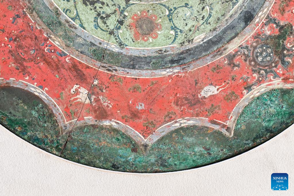 This photo taken on Aug. 25, 2023 shows part of a bronze mirror with colored patterns depicting a hunting event, collected at Xi'an Museum in Xi'an, northwest China's Shaanxi Province. (Xinhua/Li He)