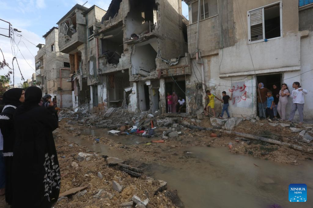 Palestinian people are seen inside a damaged building at a refugee camp in Tulkarm, northern West Bank, on Nov. 14, 2023. At least seven Palestinians were killed on Tuesday in clashes with Israeli soldiers in Tulkarm, northern West Bank, according to the Ramallah-based Palestinian Health Ministry. (Photo by Nidal Eshtayeh/Xinhua)