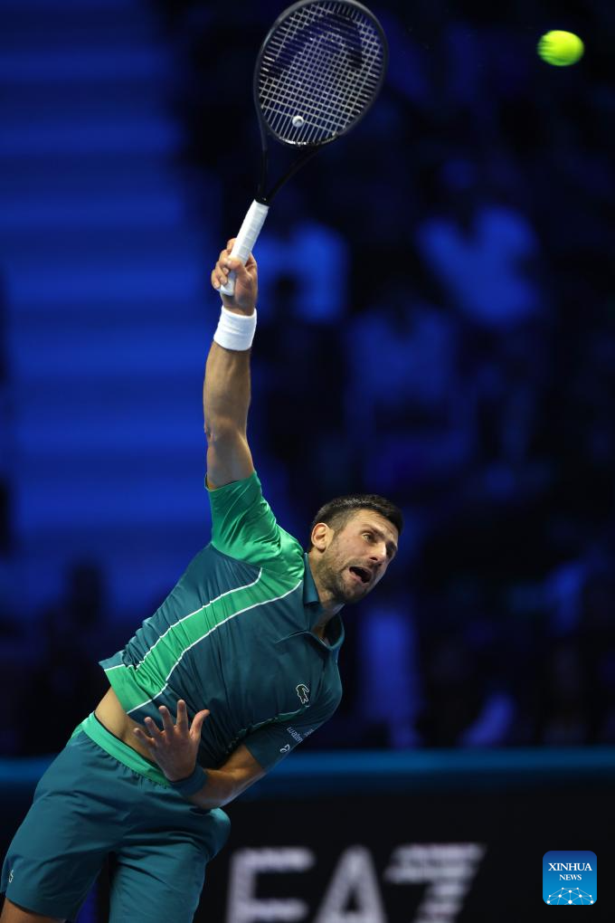 Novak Djokovic serves during the group stage match between Novak Djokovic of Serbia and Jannik Sinner of Italy at ATP Finals tennis tournament in Turin, Italy, Nov. 14, 2023. (Photo by Alberto Lingria/Xinhua)