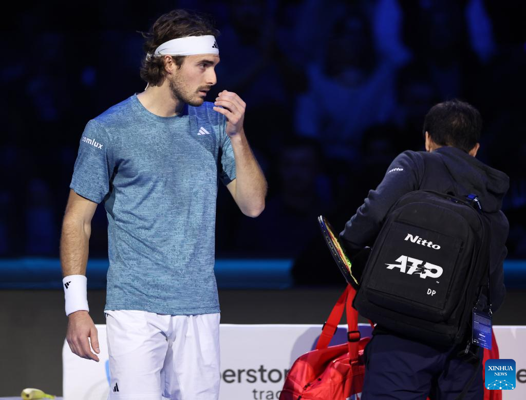 Stefanos Tsitsipas reacts after quitting the group stage match between Stefanos Tsitsipas of Greece and Holger Rune of Denmark at ATP Finals tennis tournament in Turin, Italy, on Nov. 14, 2023. (Photo by Alberto Lingria/Xinhua)