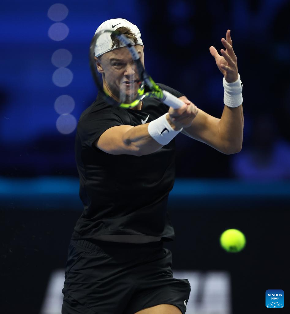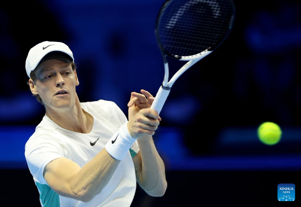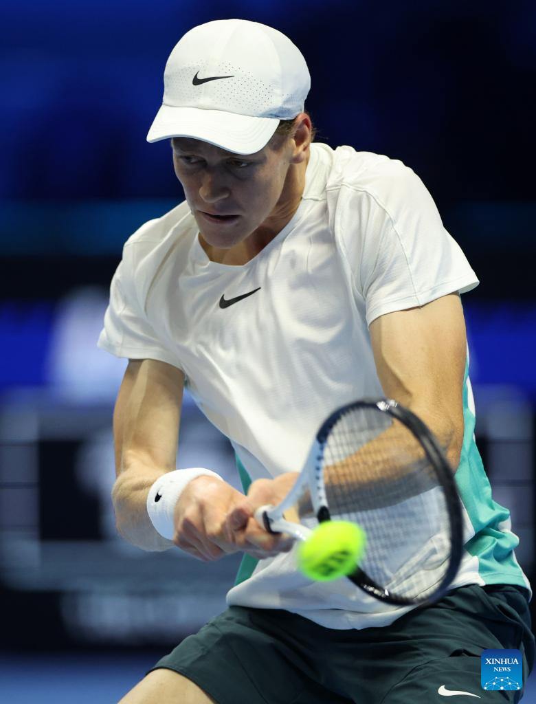 Jannik Sinner hits a return during the group stage match between Novak Djokovic of Serbia and Jannik Sinner of Italy at ATP Finals tennis tournament in Turin, Italy, Nov. 14, 2023. (Photo by Alberto Lingria/Xinhua)
