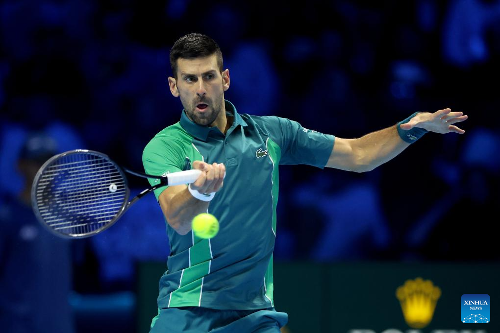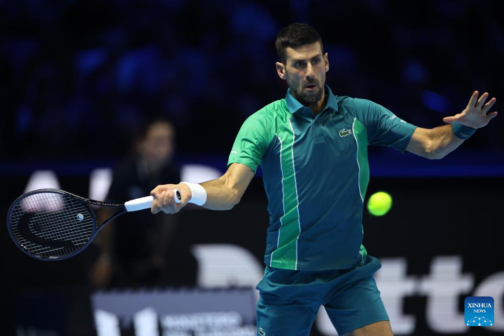 Novak Djokovic hits a return during the group stage match between Novak Djokovic of Serbia and Jannik Sinner of Italy at ATP Finals tennis tournament in Turin, Italy, Nov. 14, 2023. (Photo by Alberto Lingria/Xinhua)