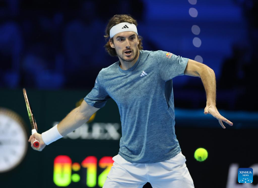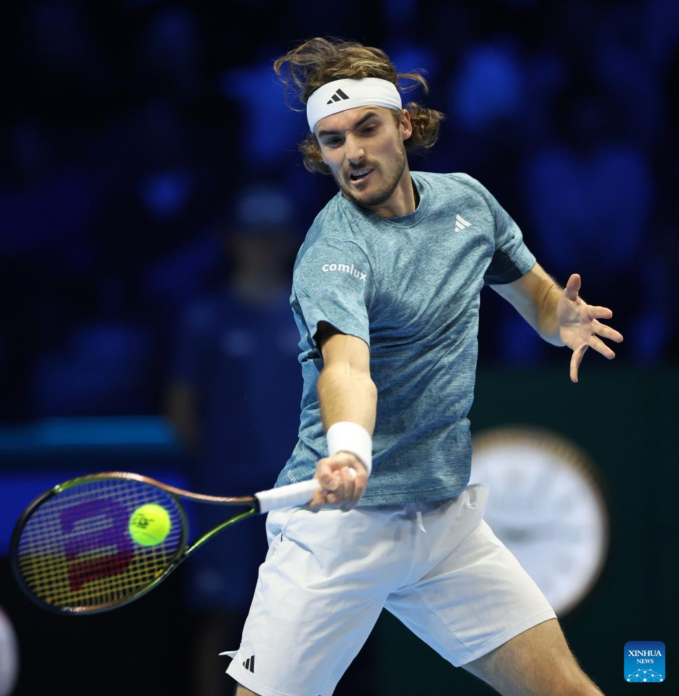 Stefanos Tsitsipas hits a return during the group stage match between Stefanos Tsitsipas of Greece and Holger Rune of Denmark at ATP Finals tennis tournament in Turin, Italy, on Nov. 14, 2023. (Photo by Alberto Lingria/Xinhua)