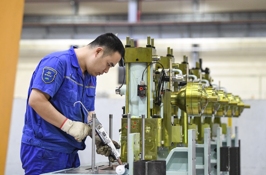 A worker is busy at a workshop of Chongqing Hongjiang Machinery Co., Ltd. in Yongchuan District of southwest China's Chongqing, Oct. 11, 2023. (Xinhua/Wang Quanchao)