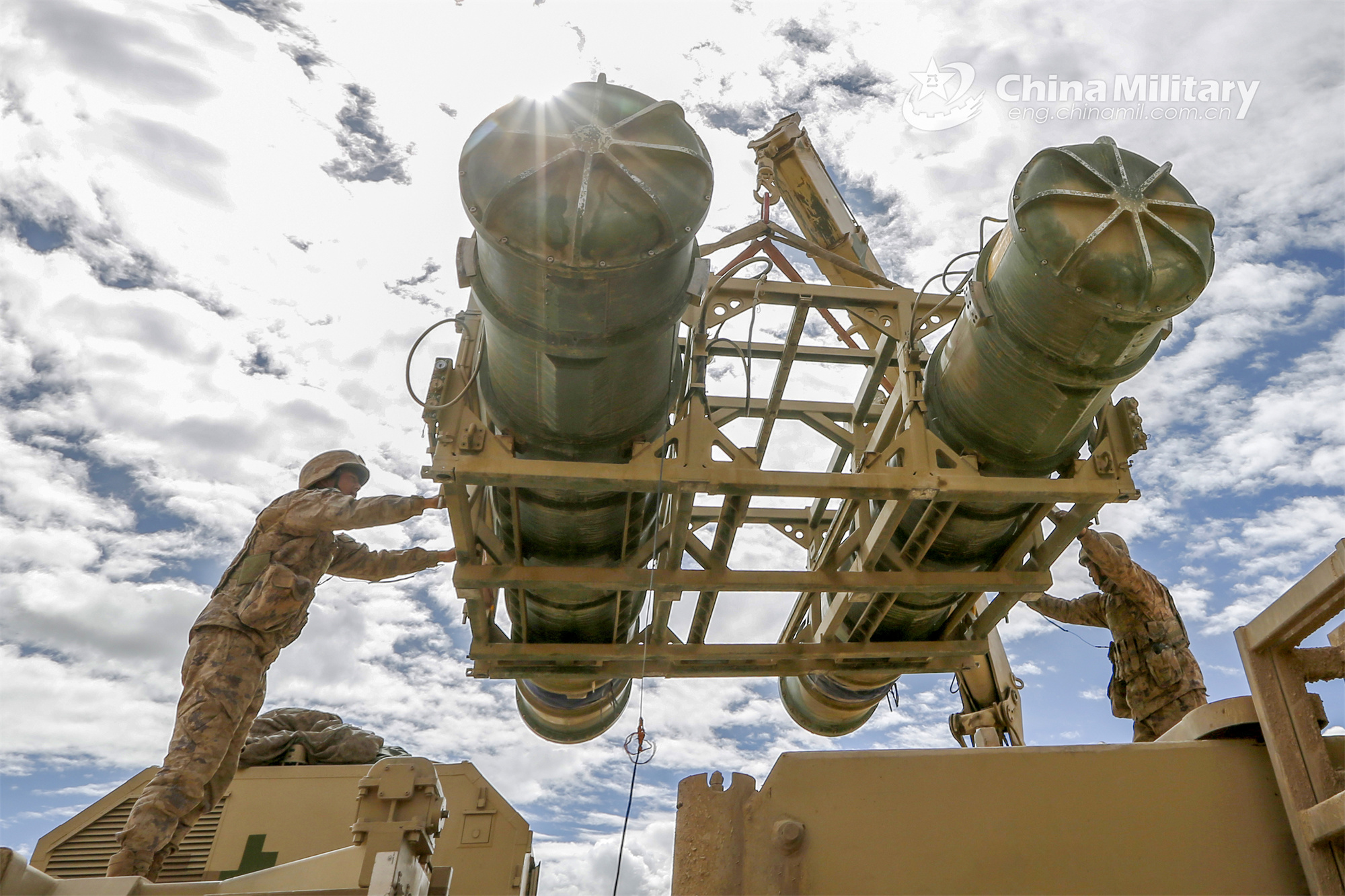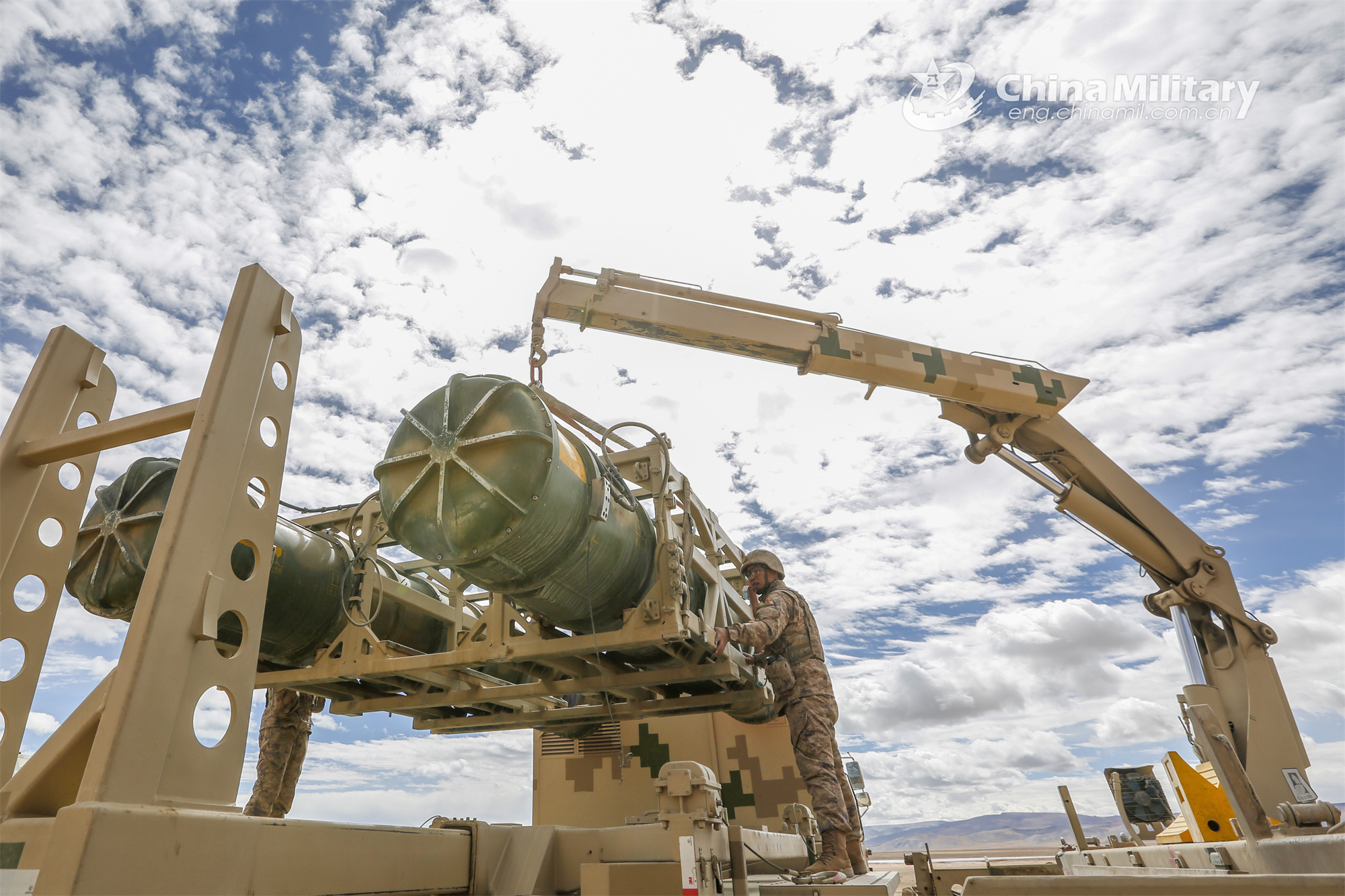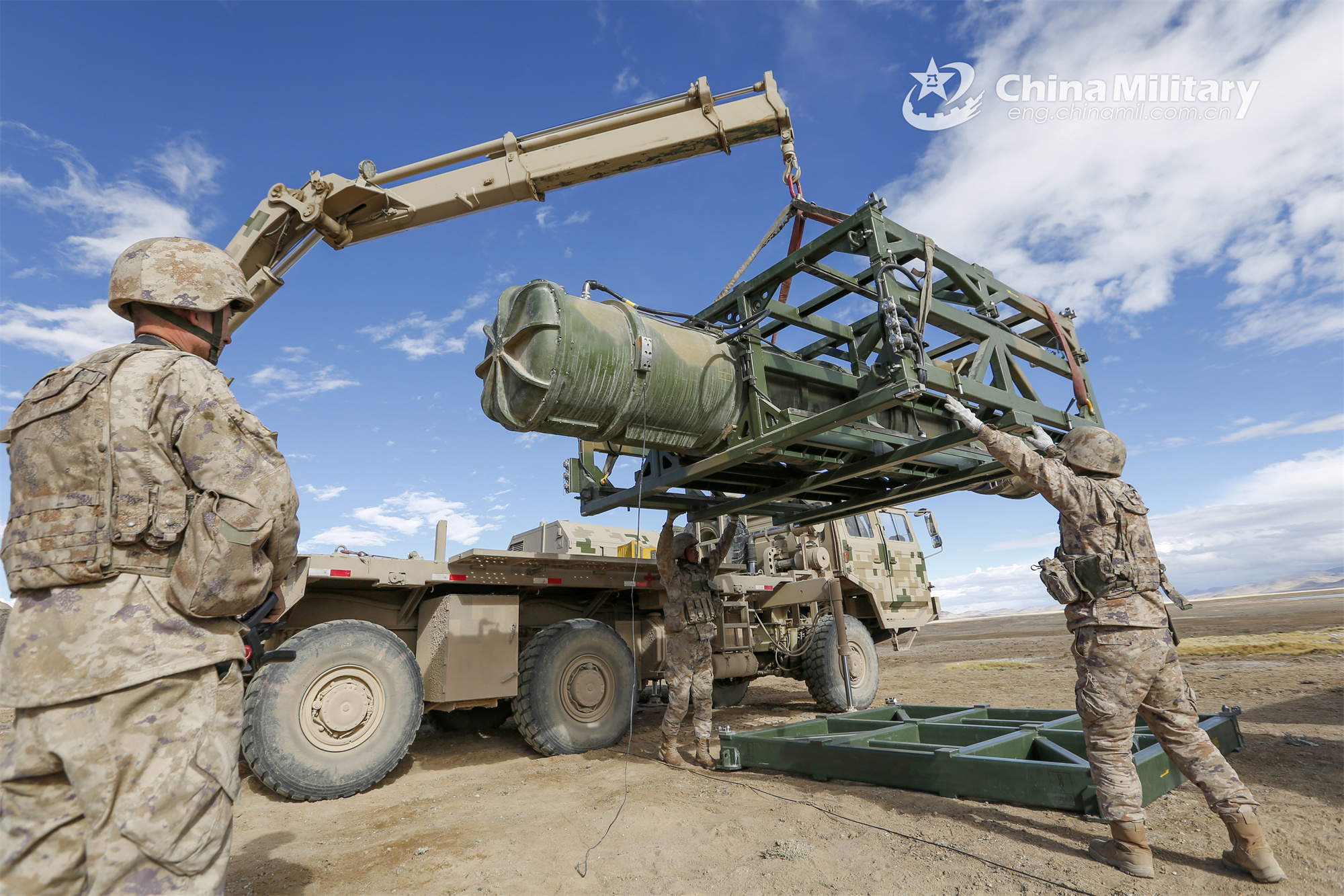 Soldiers assigned to an army missile element operate a crane to hoist and load air-defense missiles onto a launching truck during a training exercise on November 9, 2023. (eng.chinamil.com.cn/Photo by Song Shilei)