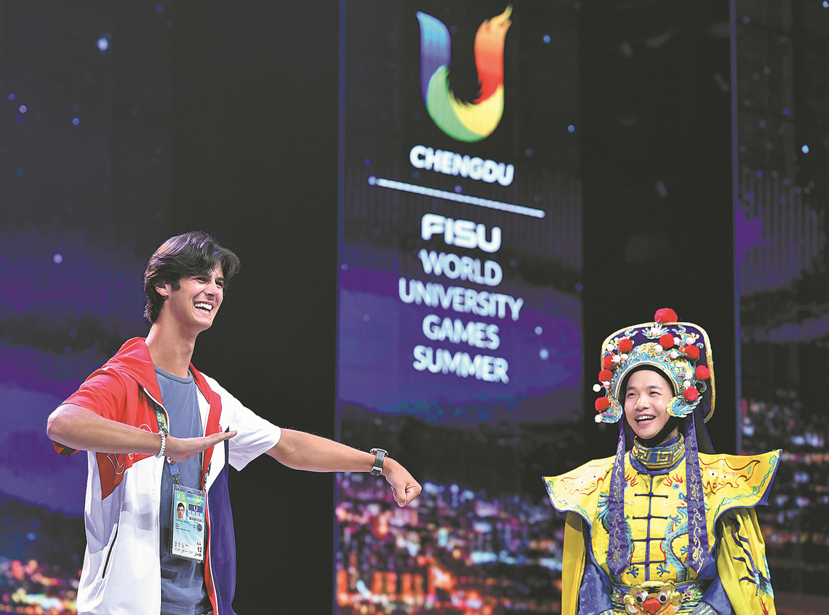 US athlete Jack Matthew Dunn matches steps with a Sichuan Opera performer during the athletes' gala at the 31st Chengdu FISU World University Games in July in Sichuan province. ZHANG DUAN/XINHUA