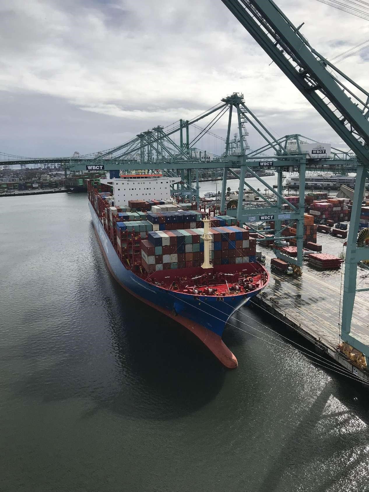 A cargo ship of China COSCO SHIPPING docks at the West Basin Container Terminal at the Port of Los Angeles. (Photo from COSCO SHIPPING (North America))