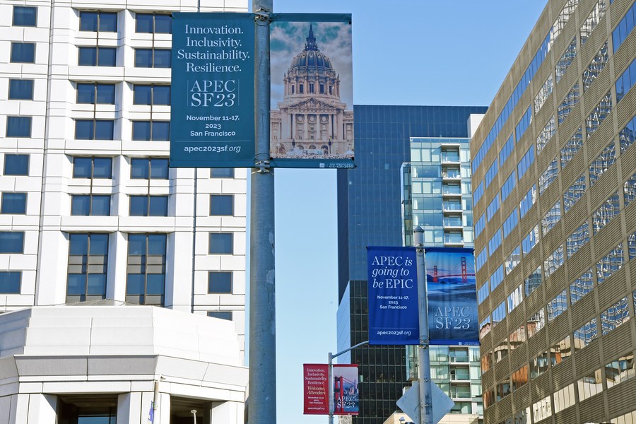 Photo taken on Nov. 12, 2023 shows the APEC 2023 signs in front of the APEC 2023 International Media Center in San Francisco, the United States. (Xinhua/Li Rui)