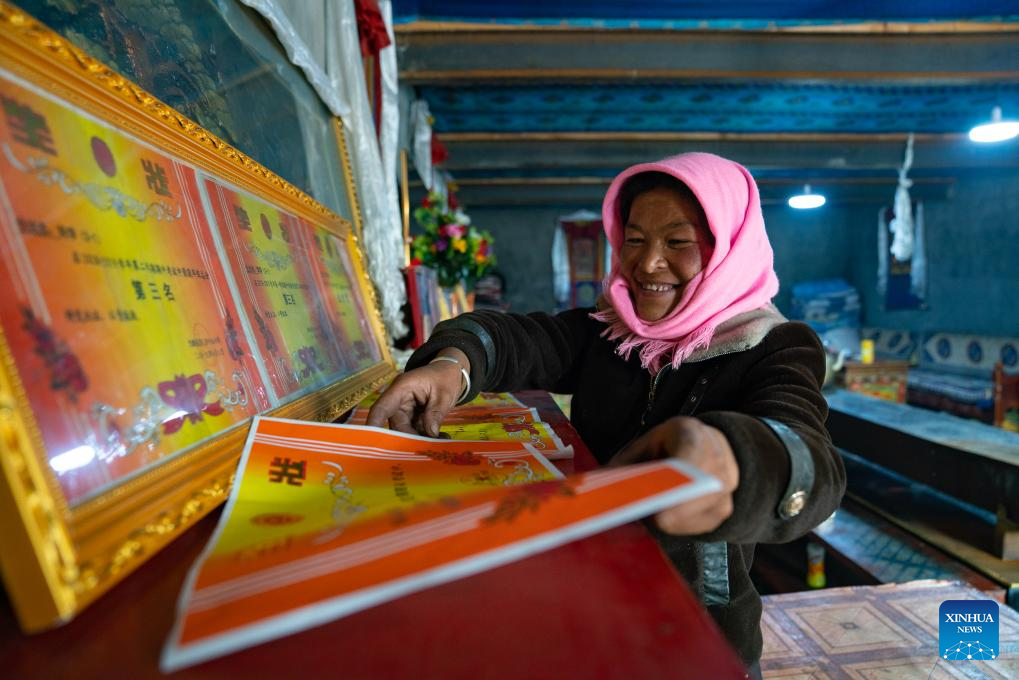 Sichod Drolma's mother arranges certificates of merit awarded to her children in Damxung County, southwest China's Xizang Autonomous Region, Nov. 9, 2023.