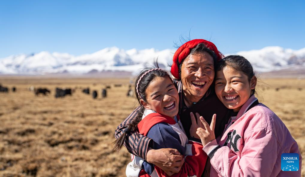 Sichod Drolma (L) and her father and sister play on the grassland in Damxung County, southwest China's Xizang Autonomous Region, Nov. 15, 2023.