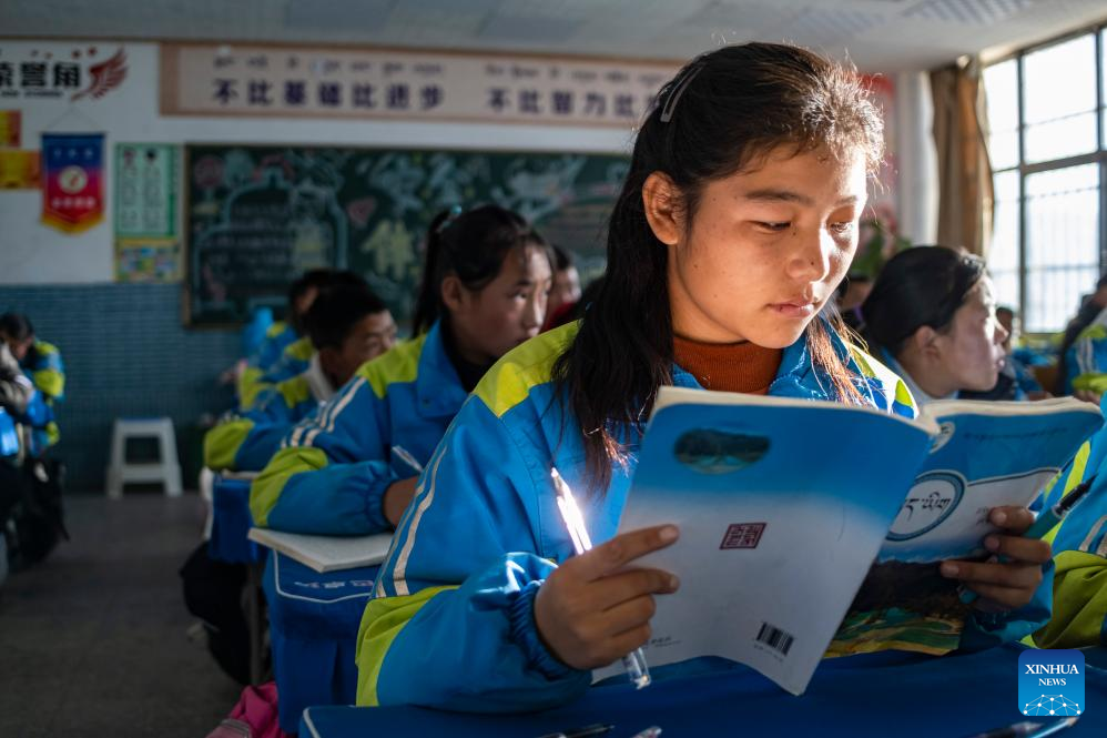 Sichod Drolma has a Tibetan language class at Damxung County Middle School in Damxung County, southwest China's Xizang Autonomous Region, Nov. 10, 2023.