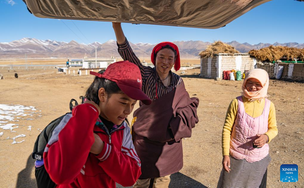Sichod Drolma (L) arrives at home in Damxung County, southwest China's Xizang Autonomous Region, Nov. 15, 2023.