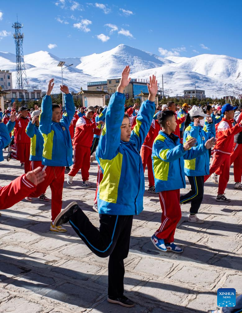 Sichod Drolma (front) does exercise at Damxung County Middle School in Damxung County, southwest China's Xizang Autonomous Region, Nov. 10, 2023.
