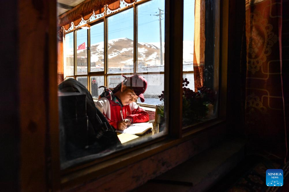 Sichod Drolma does homework at home in Damxung County, southwest China's Xizang Autonomous Region, Nov. 15, 2023.