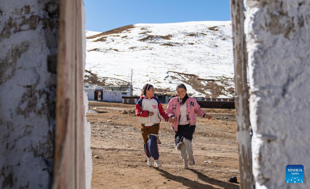 Sichod Drolma (C) and her classmates are pictured during a class-break at Damxung County Middle School in Damxung County, southwest China's Xizang Autonomous Region, Nov. 10, 2023.