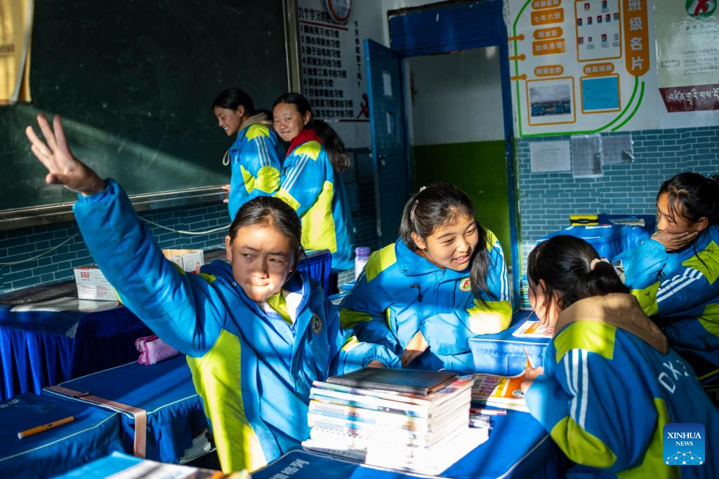Sichod Drolma (standing) answers teacher's question during a class at Damxung County Middle School in Damxung County, southwest China's Xizang Autonomous Region, Nov. 9, 2023.