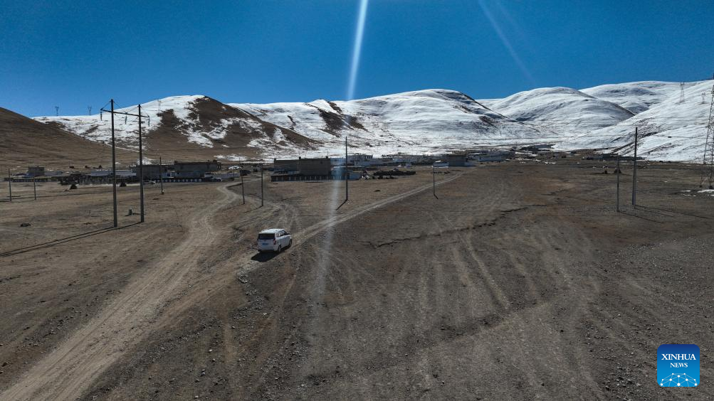 This aerial photo taken on Nov. 15, 2023 shows Sichod Drolma's father driving a car to pick her home in Damxung County, southwest China's Xizang Autonomous Region.