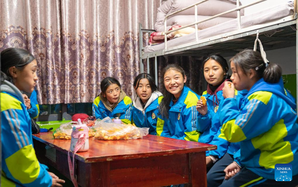 Sichod Drolma (3rd R) and her roommates enjoy leisure time in their dormitory at Damxung County Middle School in Damxung County, southwest China's Xizang Autonomous Region, Nov. 9, 2023.
